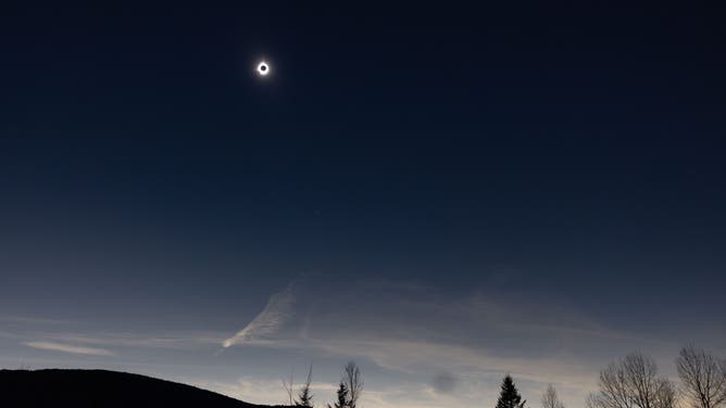 COLEBROOK, NEW HAMPSHIRE - APRIL 8: Darkness during totality of the Great North American Eclipse on April 8, 2024 in Colebrook, New Hampshire. Millions of people have flocked to areas across North America that are in the "path of totality" in order to experience a total solar eclipse. During the event, the moon will pass in between the sun and the Earth, appearing to block the sun. (Photo by Scott Eisen/Getty Images)