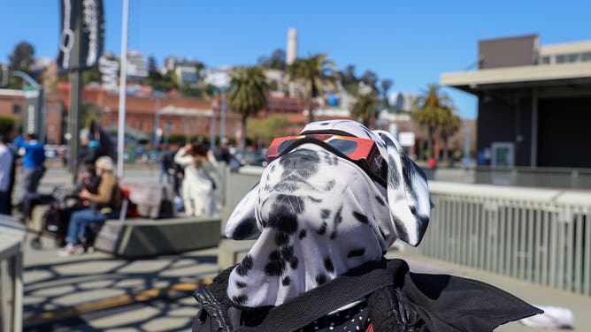 SAN FRANCISCO, CA - APRIL 8: People gather at Exploratorium to observe the total solar eclipse which seen a partial solar eclipse in %34 peak in San Francisco, California, United States on April 8, 2024. (Photo by Tayfun Coskun/Anadolu via Getty Images)