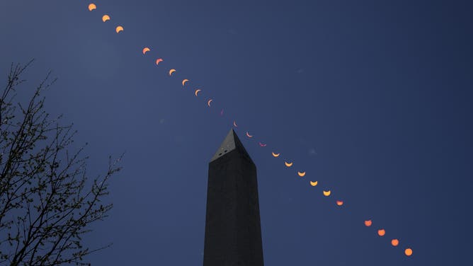 WASHINGTON, DC - APRIL 8: (EDITOR’S NOTE: This Handout image was provided by a third-party organization and may not adhere to Getty Images’ editorial policy) (EDITOR'S NOTE: Multiple exposures were used in the creation of this digital composite image) In this NASA handout, the Moon is seen passing in front of the Sun, with the top of the Washington Monument in silhouette, during a partial solar eclipse April 8, 2024 in in Washington, DC. A total solar eclipse swept across a narrow portion of the North American continent from Mexico's Pacific coast to the Atlantic coast of Newfoundland, Canada. A partial solar eclipse was visible across the entire North American continent along with parts of Central America and Europe. (Photo by Bill Ingalls/NASA via Getty Images)