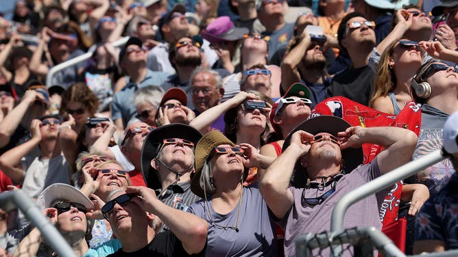 NEW YORK, NEW YORK - APRIL 08: People wear glasses to see the solar eclipse near Fox News Channel Studios on April 08, 2024 in New York City. Millions of people have flocked to areas across North America that are in the "path of totality" in order to experience a total solar eclipse. During the event, the moon will pass in between the sun and the Earth, appearing to block the sun. (Photo by John Lamparski/Getty Images)