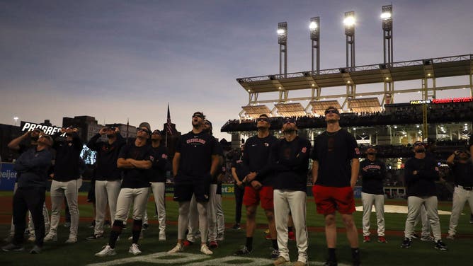 CLEVELAND, OHIO - APRIL 08: The Cleveland Guardians look up at the total solar eclipse before their home opener against the Chicago White Sox at Progressive Field on April 08, 2024 in Cleveland, Ohio. Cleveland is in the "path of totality" for today's total solar eclipse. (Photo by Mike Lawrie/Getty Images)