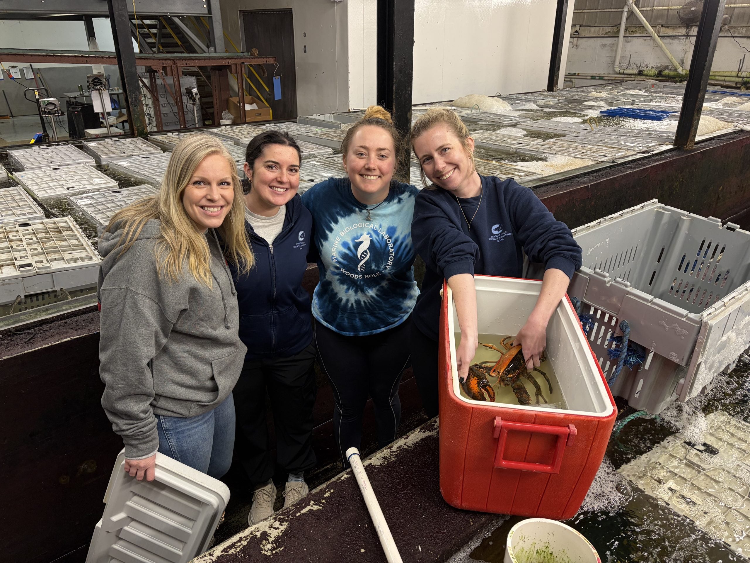 Shannon Keresey of Wellfleet Shellfish Company (left) with Woods Hole Science Aquarium representatives and the lobster.