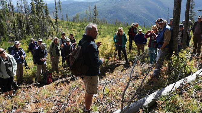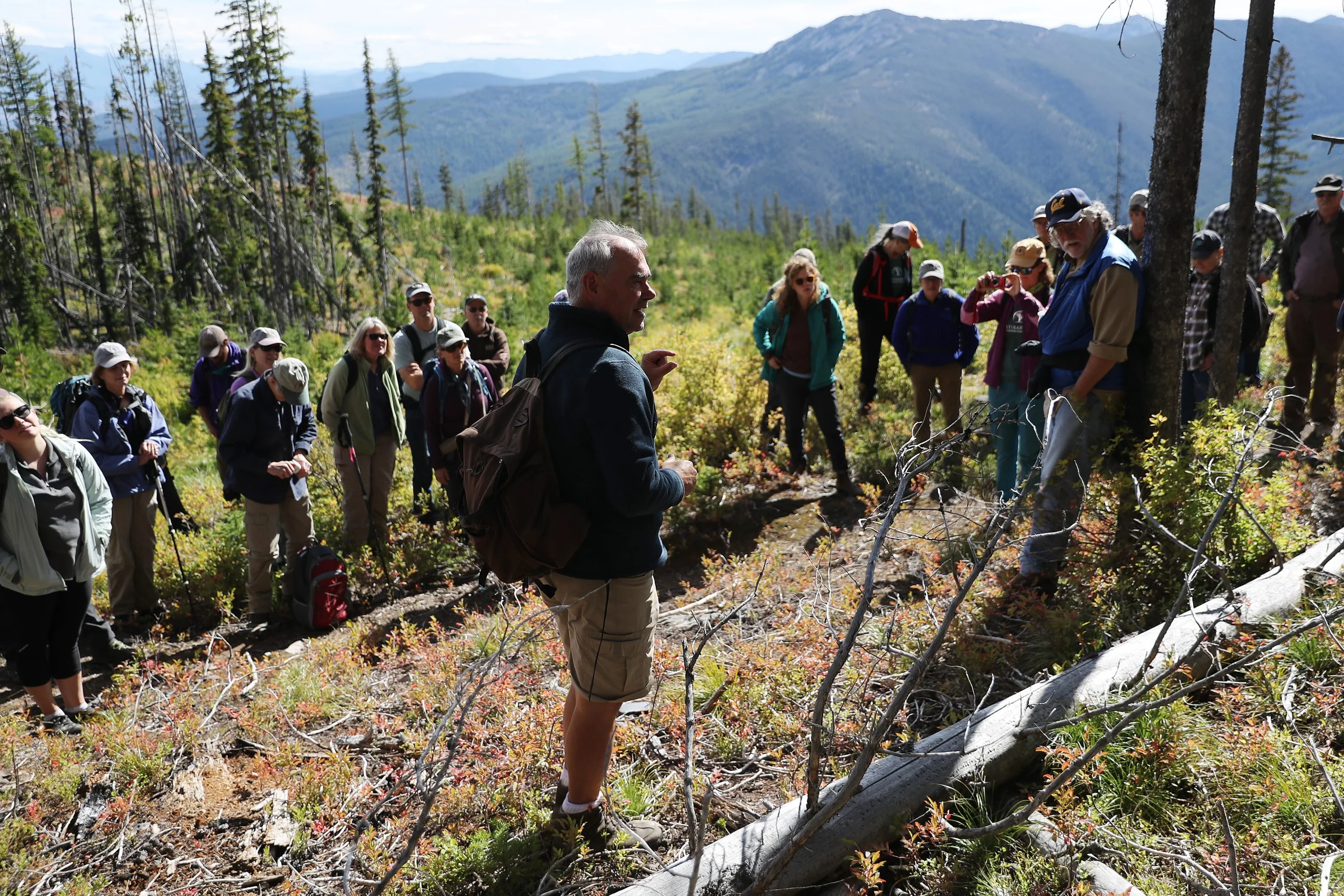 U.S. Forest Service Research Ecologist Robert Keane talks to members and guests of the Whitebark Pine Ecosystem Foundation during a guided hike into the mountains of the Flathead Indian Reservation to see examples of living and dead trees September 14, 2019 on the Flathead Reservation, Montana.