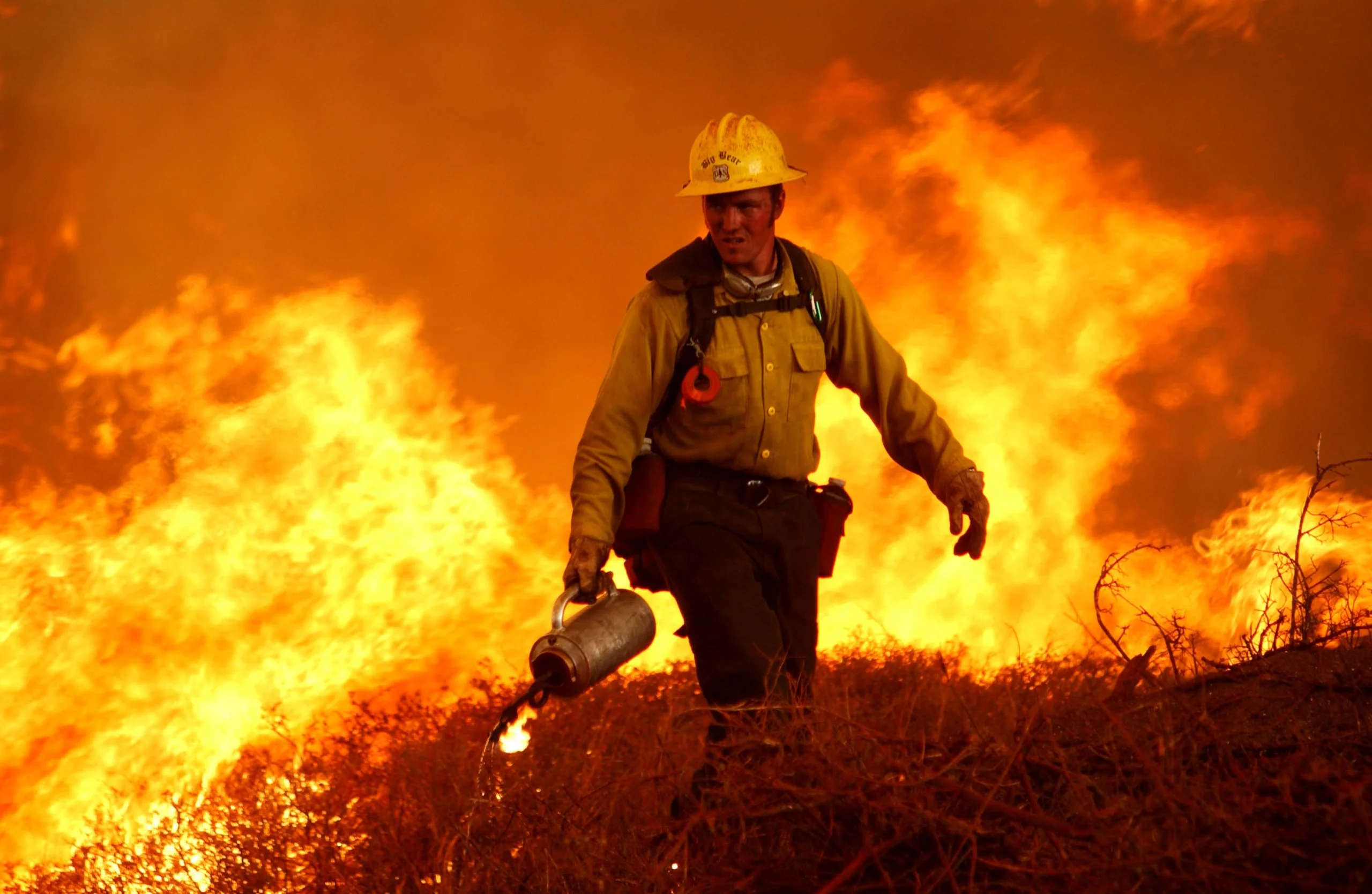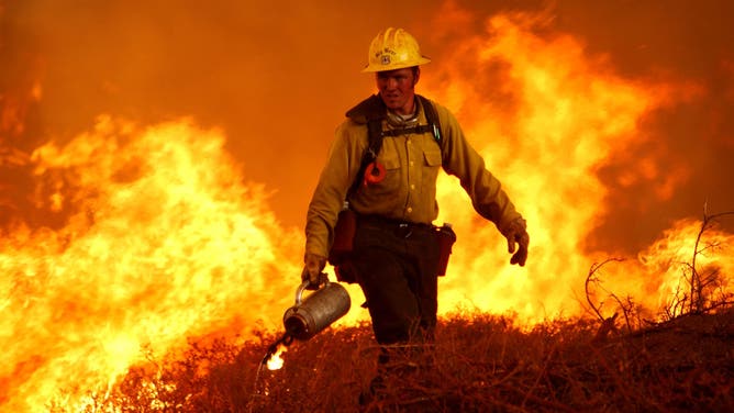 A U.S. Forest Service firefighter uses a drip torch to set a backfire on the Los Coyotes Indian Reservation to fight a fire on August 8, 2002 west of Borrego Springs, California.