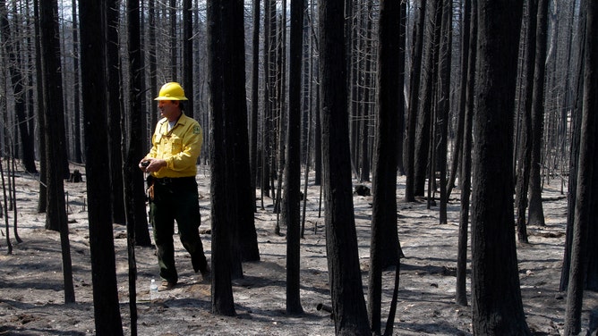 Soil Scientist Todd J. Ellsworth of US Forest Service and Manager of Forest Burned Area Emergency Response surveying the burned area of the Stanislaus National Forest near Tuolumne on Sep. 13, 2013.