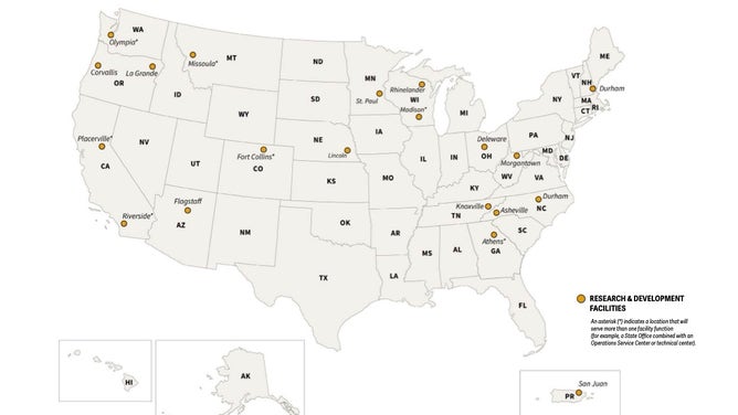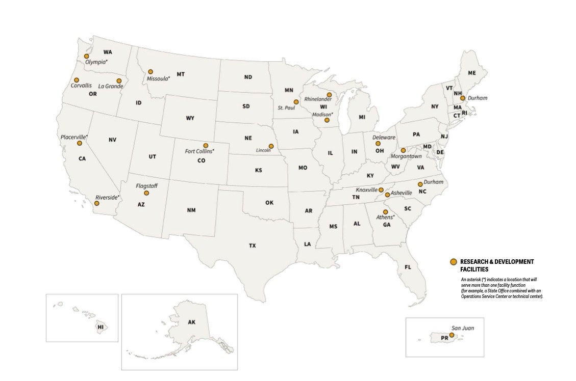 The 20 U.S. Forest Service Research and Development facilities that will continue to operate under the agency's restructure.
