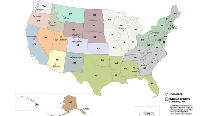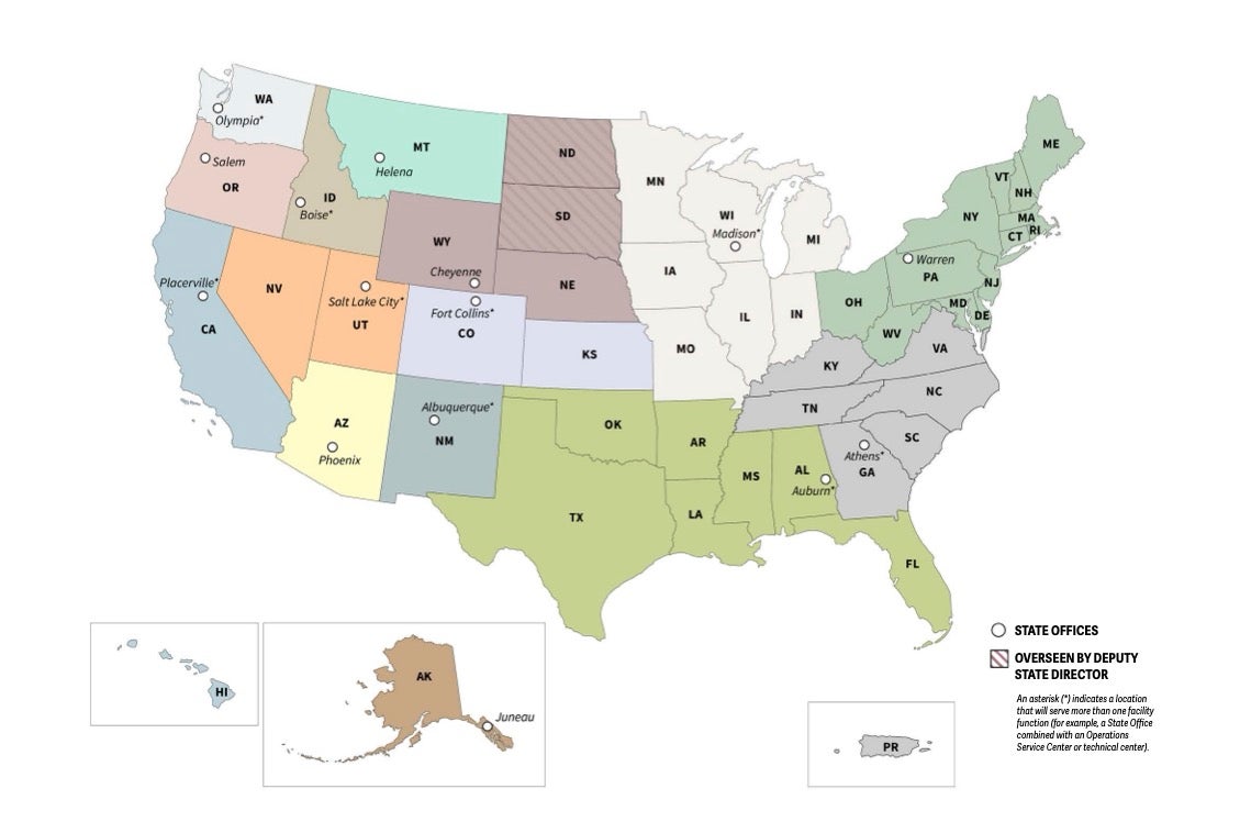 Many functions currently housed in the regional offices will be transferred to six operational hubs that will be established in Albuquerque, New Mexico; Athens, Georgia; Fort Collins, Colorado; Madison, Wisconsin; Missoula, Montana; and Placerville, California.