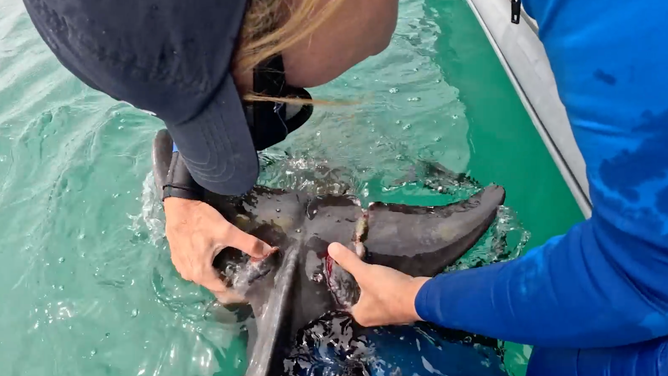 In the video, two men jump into the water and tackle the calf to remove the fishing line. One of the rescuers held the juvenile dolphin as the other used a knife to cut through the line and pulled the debris off the animal's tail.