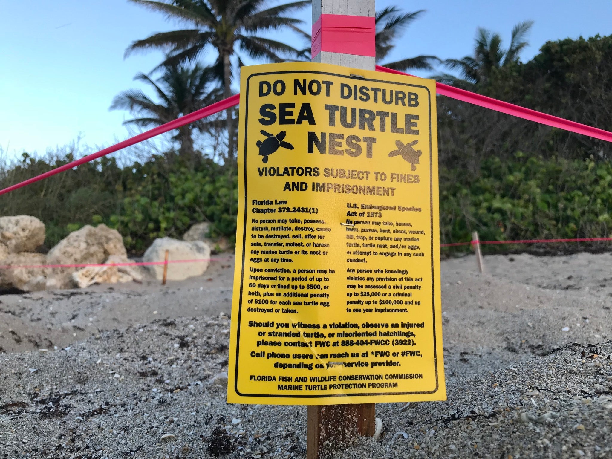 A sign warning people of a sea turtle nest in Deerfield Beach, Florida.
