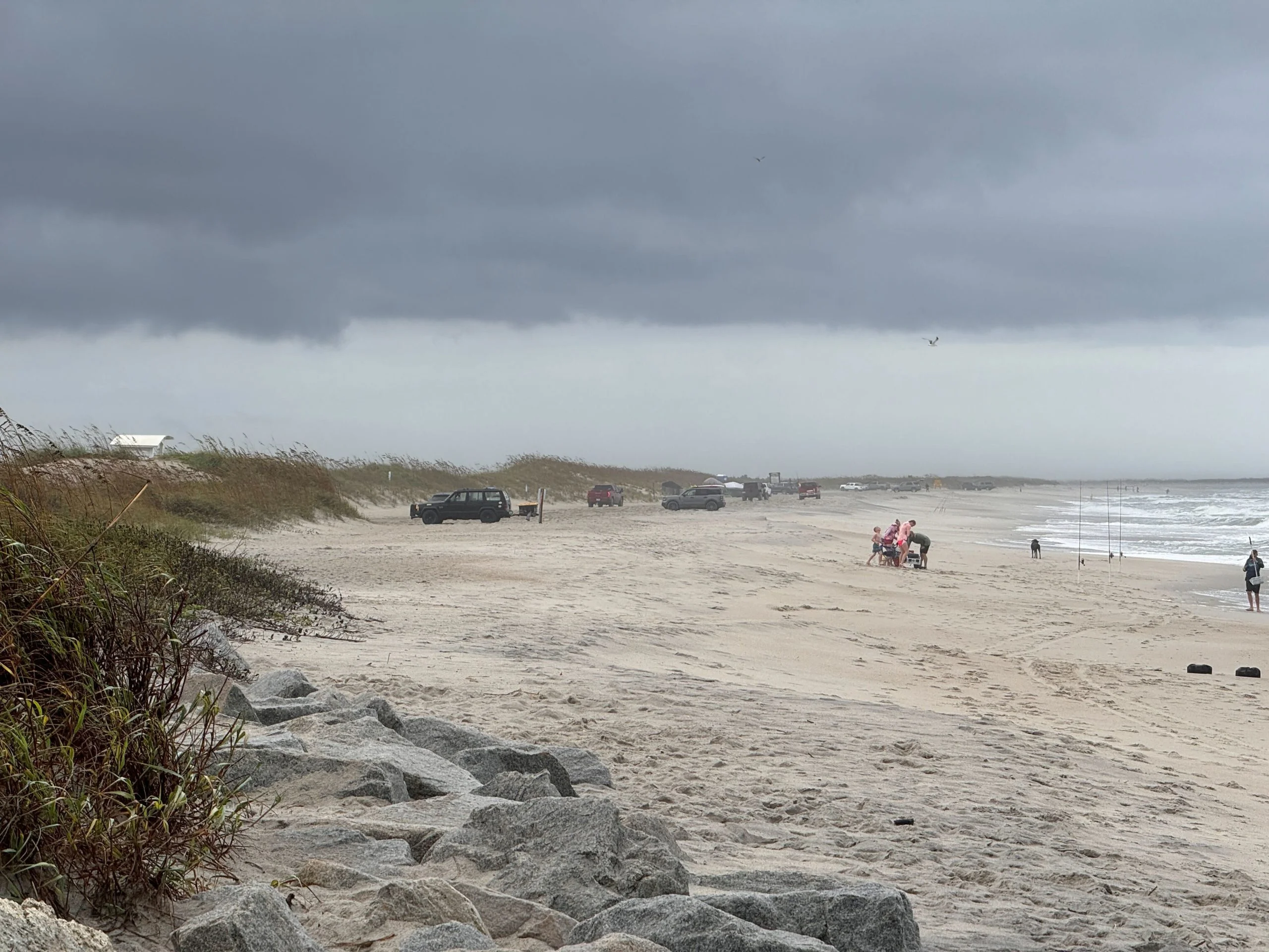 FILE – Surf pounds the beach at Carolina Beach, North Carolina, on Sept. 14, 2024, ahead of a developing system that may become a tropical depression or storm next week.