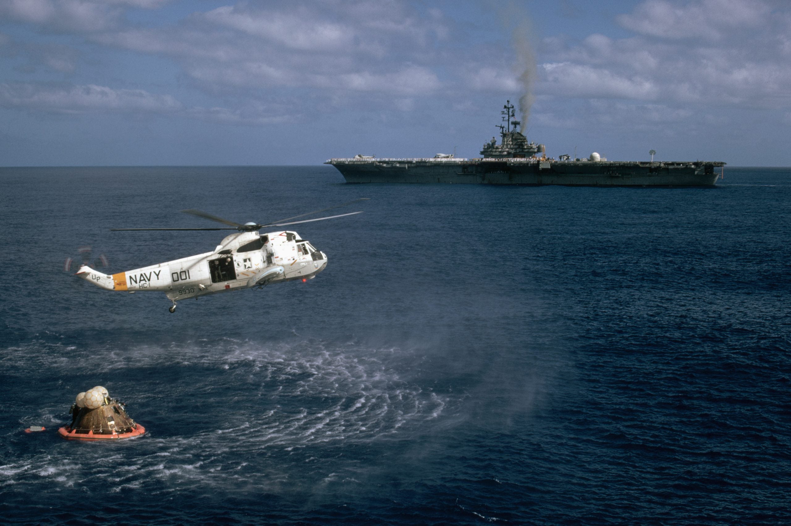 A Navy helicopter flies over the Apollo 17 after it splashes down in the Pacific Ocean. Nearby the aircraft carrier Ticonderoga cruises to pick up the capsule and astronauts. The Apollo 17 was the last flight of humans to the moon.