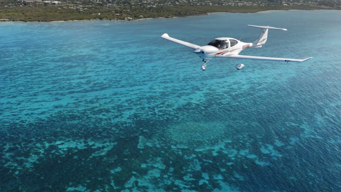 A Diamond DA-40 Diamond Star flying over the Saint Croix, USA USVI coastline.