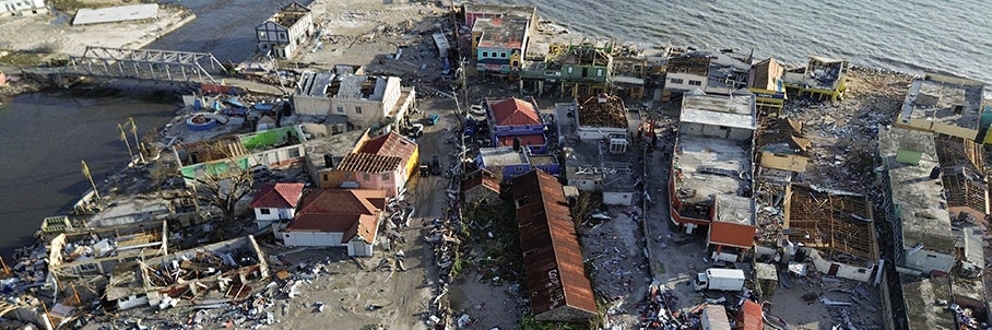 An aerial view shows destroyed buildings following the passage of Hurricane Melissa in Black River, St. Elizabeth, Jamaica, on October 29, 2025. Hurricane Melissa bore down on the Bahamas October 29 after cutting a path of destruction through the Caribbean, leaving 30 people dead or missing in Haiti and parts of Jamaica and Cuba in ruins. Somewhat weakened but still threatening, Melissa will bring damaging winds and flooding rains to the Bahamas Wednesday before moving on to Bermuda late Thursday, according to the US National Hurricane Center (NHC). (Photo by Ricardo Makyn / AFP) (Photo by RICARDO MAKYN/AFP via Getty Images)