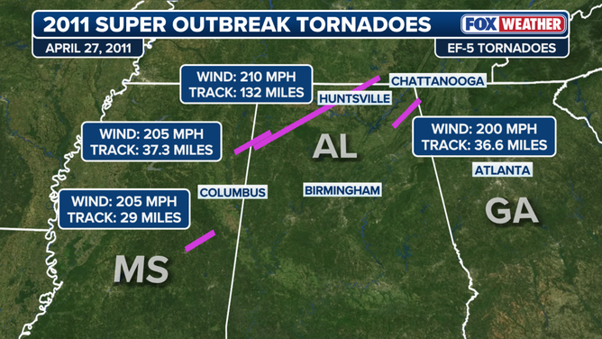 The National Oceanic and Atmospheric Administration (NOAA) reported at least 350 tornadoes formed during the 2011 outbreak, including four rare EF-5s with winds over 200 mph.