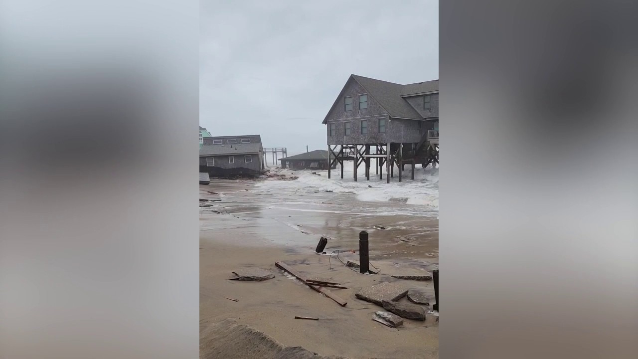 Powerful waves pummel the beaches of the Outer Banks on Tuesday, causing oceanfront homes in Buxton, North Carolina, to collapse into the Atlantic.
