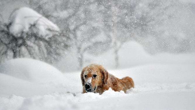 BUFFALO, NY - NOVEMBER 20: Sydney, a six year old Golden retriever, makes her way through five feet of snow from a driveway on November 20, 2014 in the suburb of Lakeview, Buffalo, New York. The record setting Lake effect snowstorm dumped up to six feet of snow in less than 24 hours closing a one hundred mile section of The New York State Thruway as well as other major roads around Buffalo. Seven deaths have already been attributed to the storm and a second round beginning late Wednesday evening will bring up to three more feet of snow overnight and into Thursday. (Photo by John Normile/Getty Images)