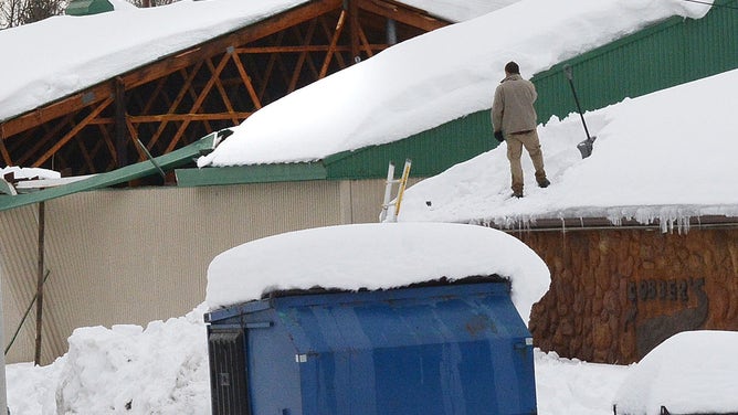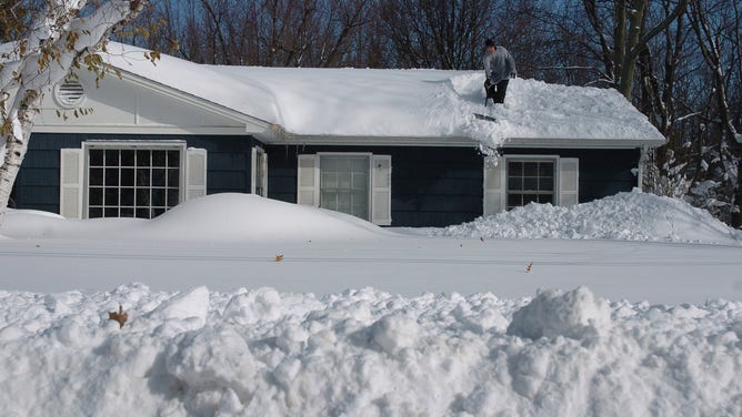 BUFFALO, NY, UNITED STATES - NOVEMBER 22: A resident works to remove snow from the roof on November 22, 2014 in Buffalo, New York. (Photo by Patrick McPartland/Anadolu Agency/Getty Images)