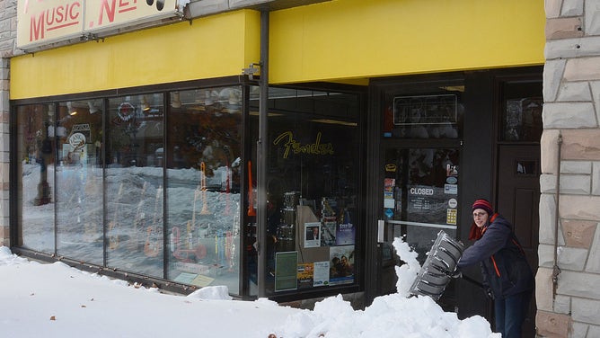 BUFFALO, NY, UNITED STATES - NOVEMBER 21: A resident works to clear snow in front of his workplace on November 21, 2014 in Buffalo, New York as the death toll attributed to Buffalo snow rises to 14. A brutal blast of Arctic air triggered a lake-effect storm and snow in the states of New York, Ohio, Michigan, Wisconsin and Pennsylvania. (Photo by Patrick McPartland/Anadolu Agency/Getty Images)