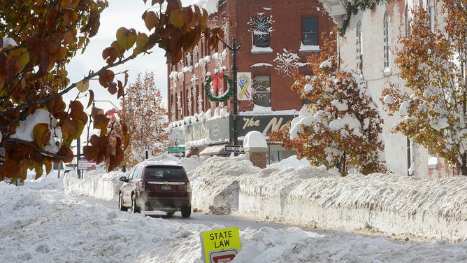 BUFFALO, NY, UNITED STATES - NOVEMBER 21: A car on a snowy road on November 21, 2014 in Buffalo, New York as the death toll attributed to Buffalo snow rises to 14. A brutal blast of Arctic air triggered a lake-effect storm and snow in the states of New York, Ohio, Michigan, Wisconsin and Pennsylvania. (Photo by Patrick McPartland/Anadolu Agency/Getty Images)