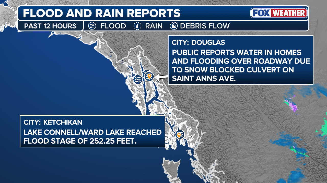 In Douglas, Alaska, southwest of Juneau, flooding has been reported in homes and on roads.