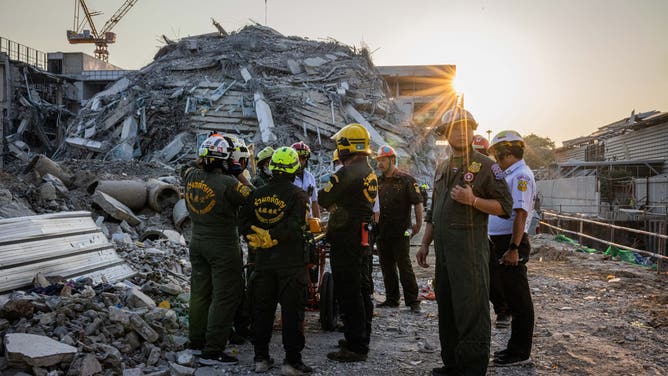 BANGKOK, THAILAND - MARCH 28: Thai rescue teams provide aid at a construction building collapse in Bangkok's Chatuchak area on March 28, 2025 in Bangkok, Thailand. A powerful 7.7 magnitude earthquake struck Myanmar on March 28, 2025, causing strong tremors that were felt in Bangkok, where buildings swayed and hundreds of people evacuated onto the streets. (Photo by Lauren DeCicca/Getty Images)