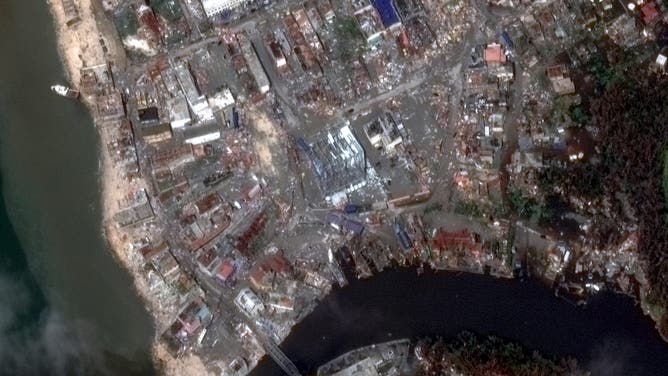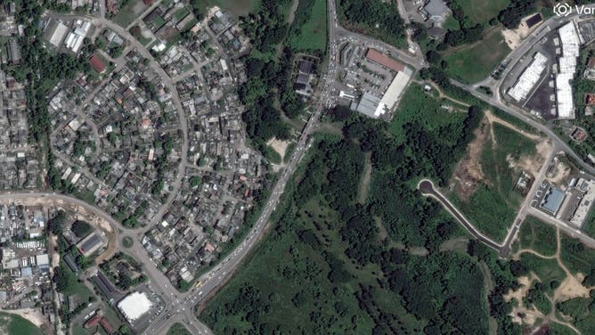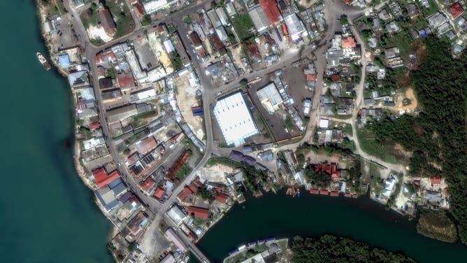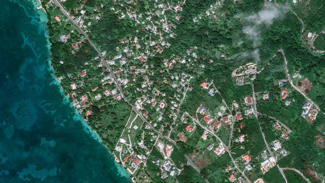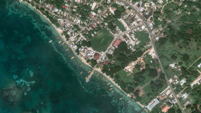 Satellite imagery captured before displays a vibrant coastal community with several churches, supermarkets, fish markets and river safari tours. Hurricane Melissa flattened the coastal town, dismantling and razing every major structure photographed before.