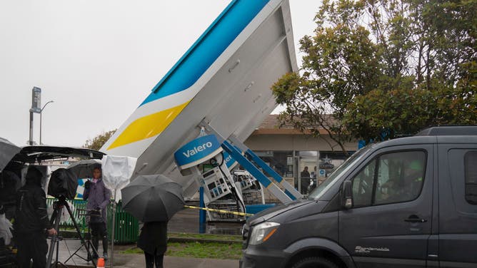 SAN FRANCISCO, CALIFORNIA - JANUARY 05: The canopy of a Valero gas station rests on the ground after being toppled by a storm on January 5, 2023 in San Francisco, California. A heavy winter storm hit Northern California on January 4. (Photo by Liu Guanguan/China News Service/VCG via Getty Images)