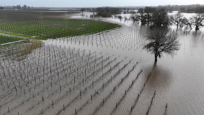 SANTA ROSA, CALIFORNIA - JANUARY 09: In an aerial view, water floods a vineyard on January 09, 2023 in Santa Rosa, California. The San Francisco Bay Area and much of Northern California continues to get drenched by powerful atmospheric river events that have brought high winds and flooding rains. The storms have toppled trees, flooded roads and cut power to tens of thousands. Storms are lined up over the Pacific Ocean and are expected to bring more rain and wind through the end of the week. (Photo by Justin Sullivan/Getty Images)
