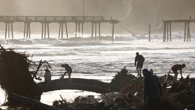 CAPITOLA, CALIFORNIA - JANUARY 10: People gather near storm debris washed up on the beach, with a storm-damaged pier in the background, on January 10, 2022 in Capitola, California. The San Francisco Bay Area and much of Northern California continues to get drenched by powerful atmospheric river events that have brought high winds and flooding rains. The storms have toppled trees, flooded roads and cut power to tens of thousands. Storms are lined up over the Pacific Ocean and are expected to bring more rain and wind through the end of the week. (Photo by Mario Tama/Getty Images)