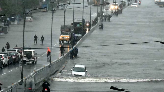 CHENNAI, India – Dramatic video shows one of many rescues across South India amid historic flooding as crews pulled a man trapped by raging floodwaters after Cyclone Michaung made landfall.