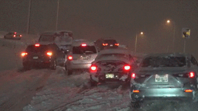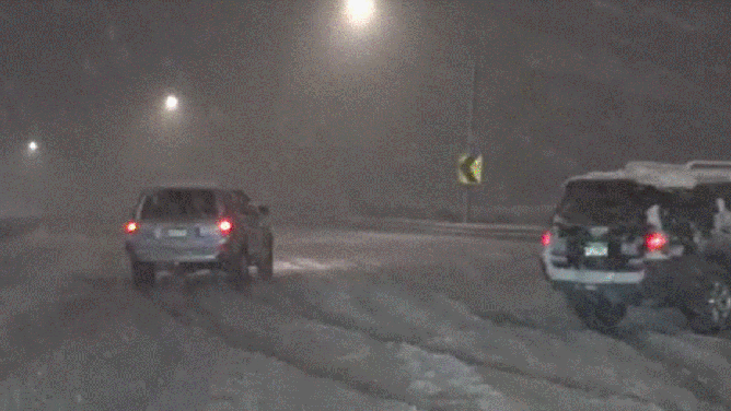 "Denver chaos with heavy wet snow," storm chaser David Baxter told FOX Weather. "Tons of slide-offs, stalled vehicles, cars stuck on a bridge and a live spin out in front of me. Craziness."