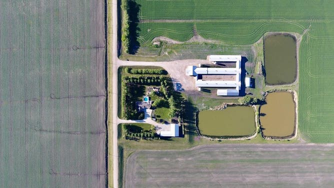 You can see from aerial pictures taken last June that the barn and homestead are usually surrounded by green fields. Now, the barn, with 38,000 pullets and egg-laying chickens, is an island.