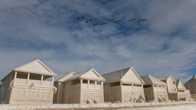 Geese fly over frozen homes in the waterfront community of Crystal Beach in Fort Erie, Ontario, Canada, on December 28, 2022, following a massive snow storm that knocked out power in the area to thousands of residents. (Photo by Cole Burston / AFP) (Photo by COLE BURSTON/AFP via Getty Images)
