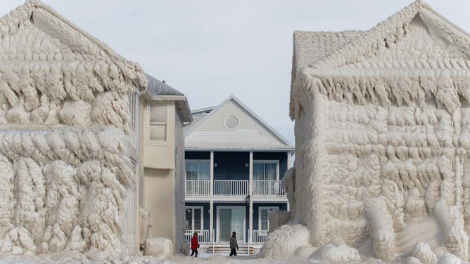 TOPSHOT - People walk by homes covered in ice at the waterfront community of Crystal Beach in Fort Erie, Ontario, Canada, on December 28, 2022, following a massive snow storm that knocked out power in the area to thousands of residents. (Photo by Cole Burston / AFP) (Photo by COLE BURSTON/AFP via Getty Images)