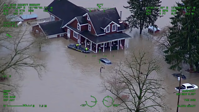 Deputies from the King County Sheriff's Office rescued a man who was trapped on top of his car in major floodwaters from the Snoqualmie River. In Duvall, the King County Sheriff's Office Marine Unit team performed a high water rescue by deploying a boat to reach two people stranded in their homes.
