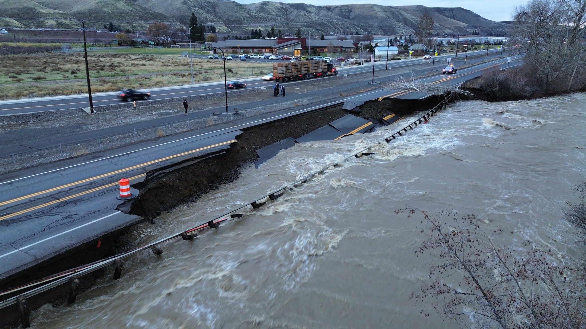 The Naches River entirely swallowed a large portion US 12 in Naches, causing extreme damage to the road that remains closed after the river completely eroded the embankment.