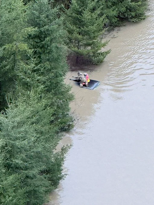 Washington National Guard aviation crew rescues a stranded person on top of their vehicle completely overtaken by flood water in Skagit County.