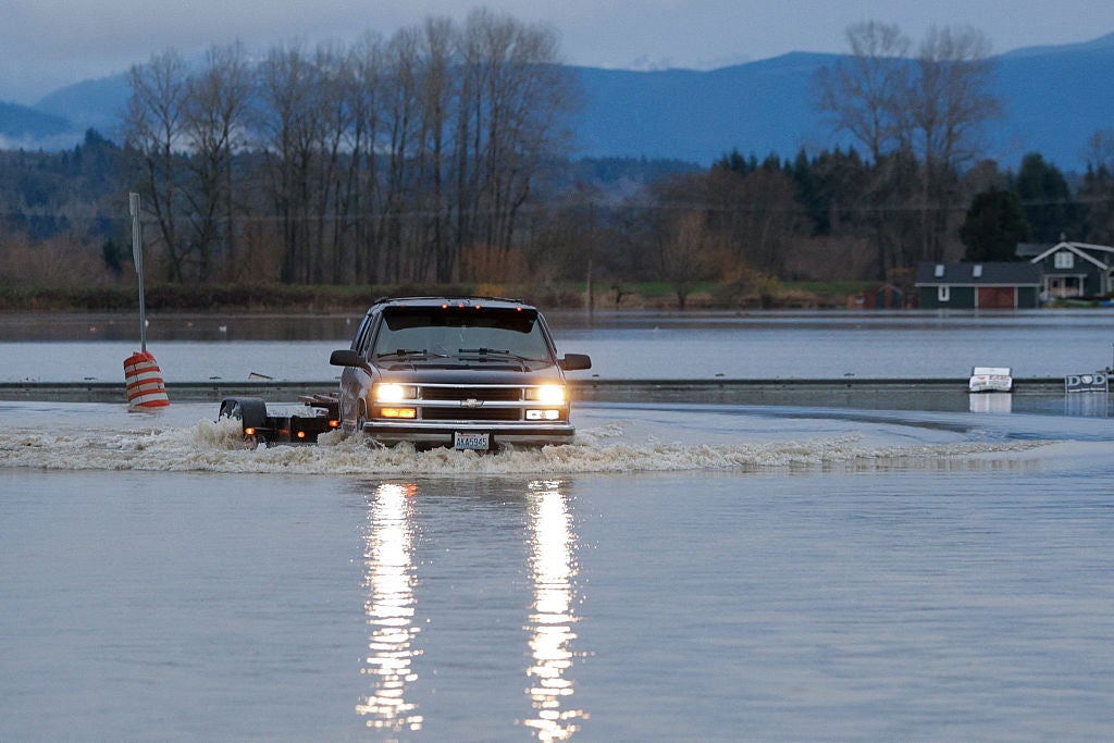 A driver manages to drive through flood waters from the Snohomish River in Snohomish, Washington, on December 11, 2025. Tens of thousands of people were under evacuation orders Thursday in western North America, after days of heavy rain forced rivers to burst their banks. Storms have battered Washington state in the US and British Columbia over the Canadian border for several days, with rivers continuing to rise.