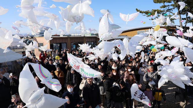 People release dove-shaped balloons in memory of the victims of the 2011 earthquake and tsunami disaster in Natori City, Miyagi Prefecture on March 11, 2026, on the 15th anniversary of the disaster.