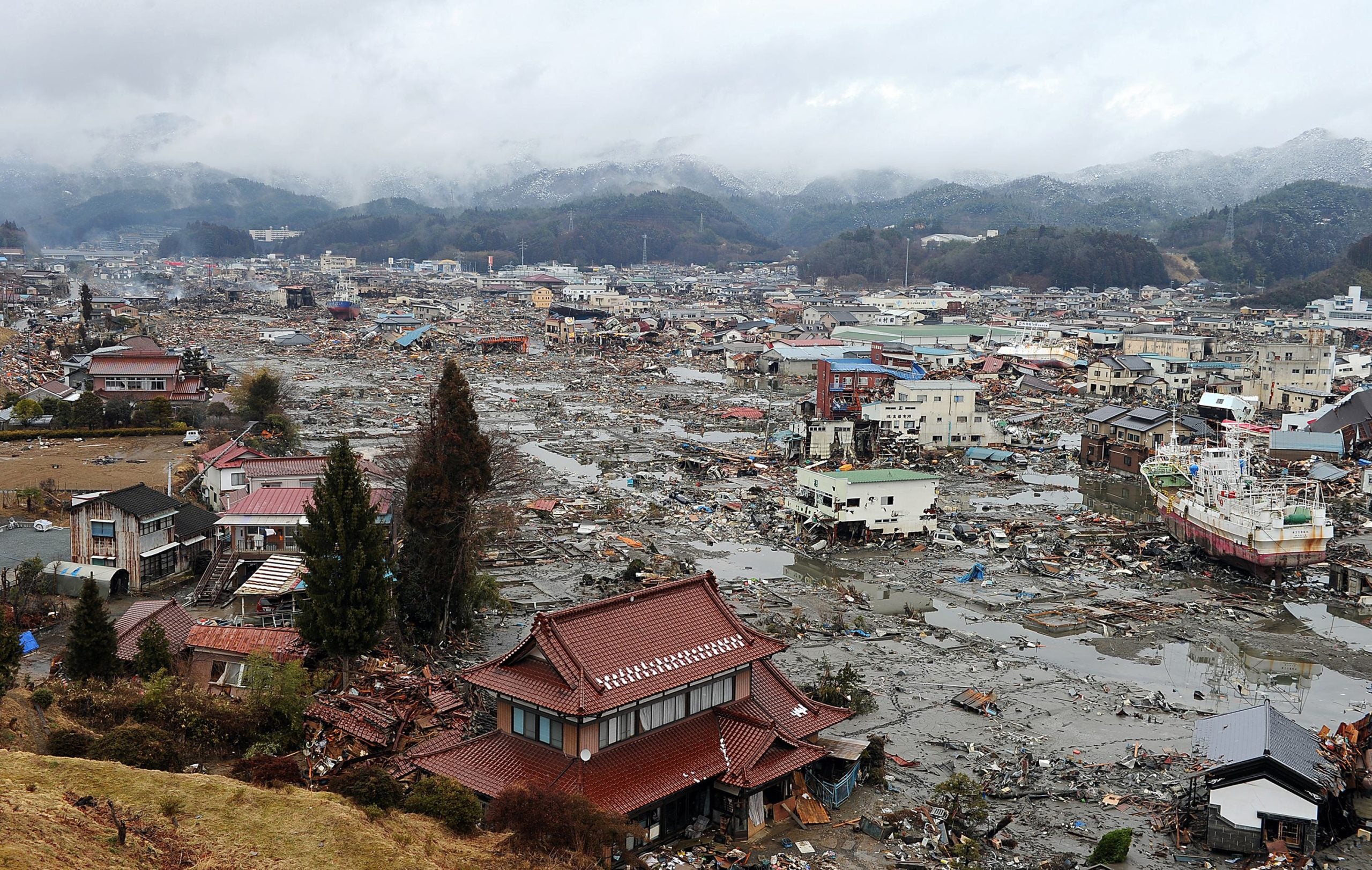 Damage caused by the March 11 tsunami is seen from a hill overlooking the city of Kesennuma on March 16, 2011.