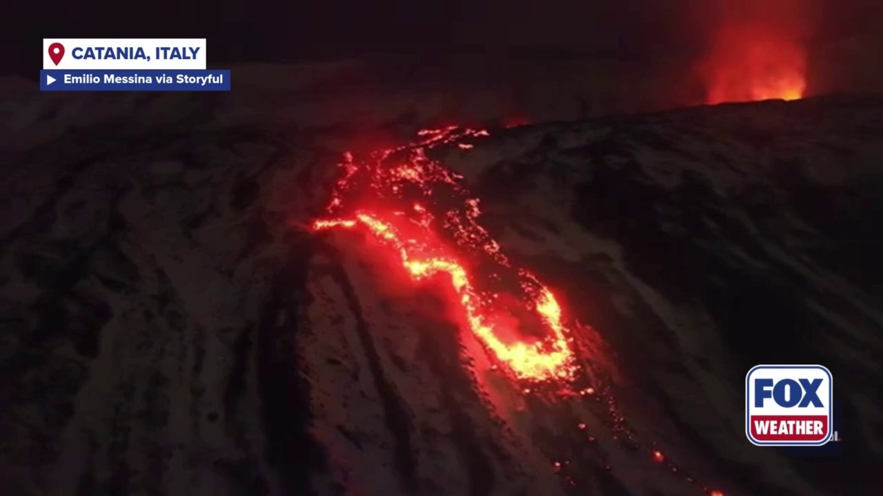 Drone video from New Year's Day shows lava spilling and cracking from a new fissure in Mount Etna. The volcano recently erupted over the Christmas holiday in December.