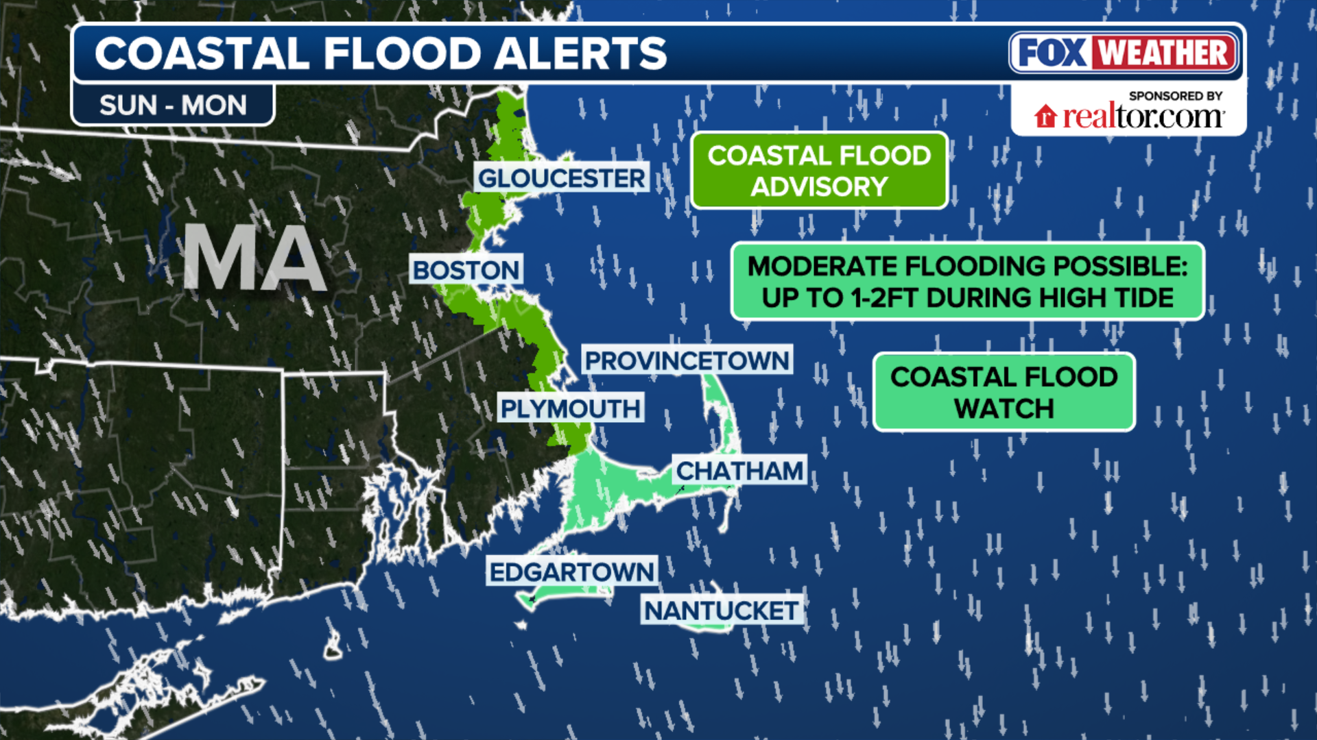 Coastal flood alerts stretch the entire coast of Massachusetts on Sunday and Monday.