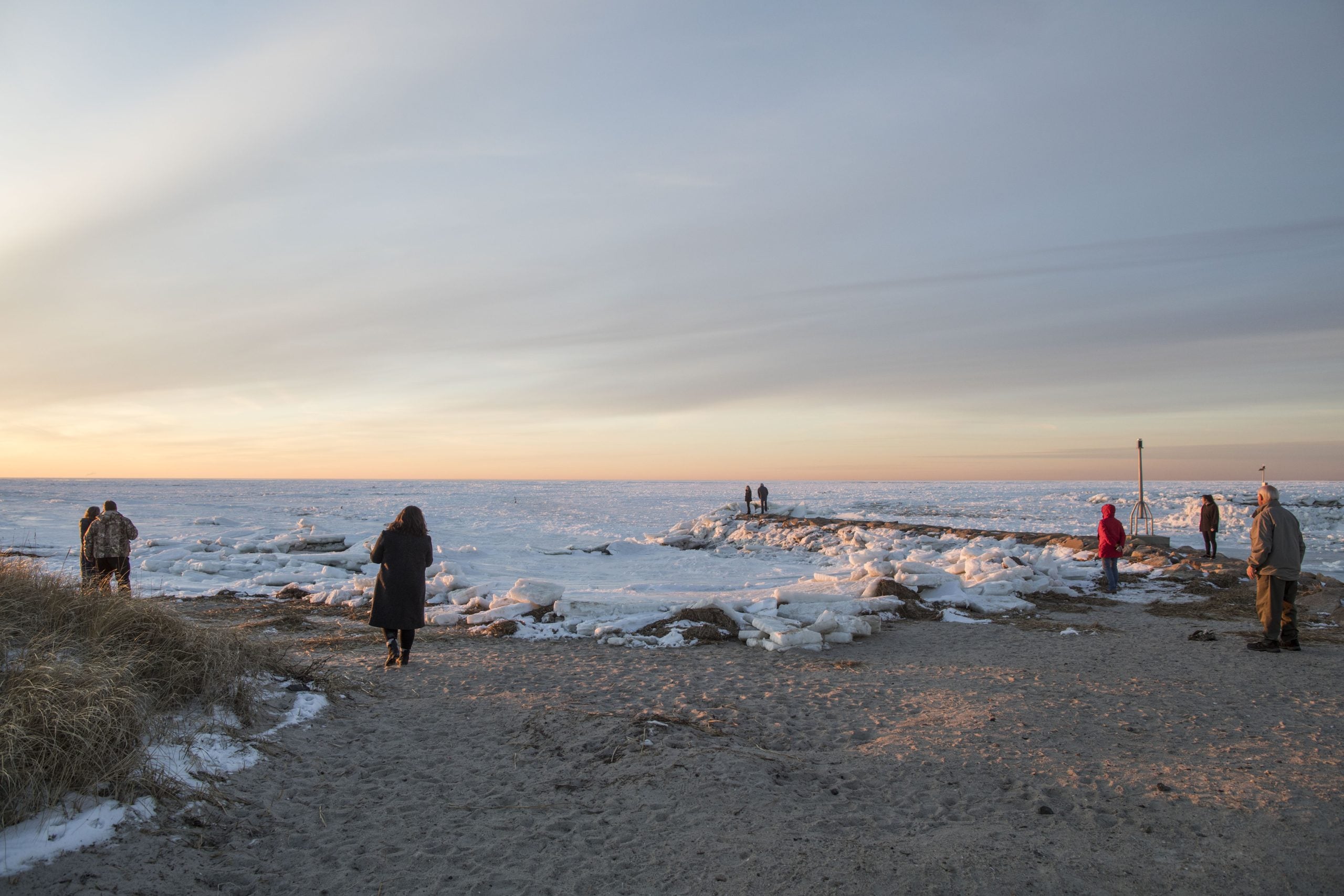 ORLEANS, MA - JANUARY 03: Onlookers gather to photograph and watch the ice that covers Cape Cod Bay on January 3, 2018 in Orleans, Massachusetts.