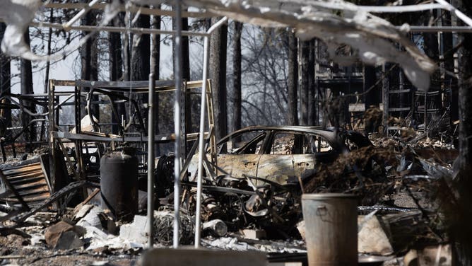 A burned vehicle smolders in the Paynes Creek area of unincorporated Tehama County, California, during the Park fire on July 27, 2024. The fast-moving and rapidly growing wildfire has forced more than 4,000 people to evacuate as firefighters battle gusty winds and perilously dry conditions, authorities said on July 26, 2024. An arsonist is suspected to have started the fire which has burned more than 340,000 acres and burned dozens of homes. (Photo by JOSH EDELSON / AFP) (Photo by JOSH EDELSON/AFP via Getty Images)