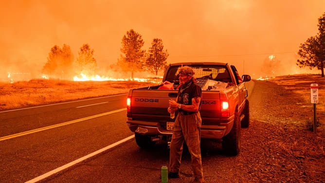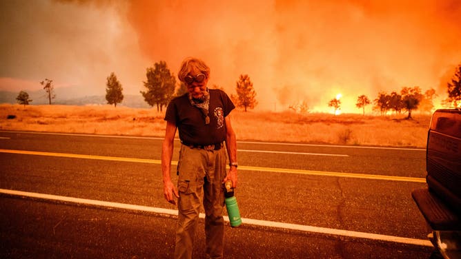 Surrounded by flames, resident Grant Douglas takes a pause on the side of the while evacuating his wife and dog as the Park fire continues to burn near Paynes Creek in unincorporated Tehama County, California on July 26, 2024. More than 1,150 personnel are deployed to fight the blaze, which has burned more than 180,000 acres and burned dozens of homes, and more than 3,500 people have been forced to flee their homes, according to the California Department of Forestry and Fire Protection. (Photo by JOSH EDELSON / AFP) (Photo by JOSH EDELSON/AFP via Getty Images)