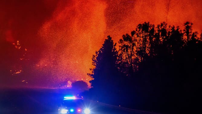 A police car drives past swirling embers as the Park fire continues to burn near Paynes Creek in unincorporated Tehama County, California on July 26, 2024. A huge, fast-moving and rapidly growing wildfire in northern California has forced more than 4,000 people to evacuate as firefighters battle gusty winds and perilously dry conditions, authorities said on July 26. (Photo by JOSH EDELSON / AFP) (Photo by JOSH EDELSON/AFP via Getty Images)