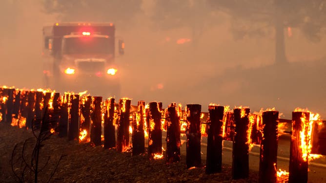 A fire engine drives past flaming highway guard rails as the Park fire continues to burn near Paynes Creek in unincorporated Tehama County, California on July 26, 2024. A huge, fast-moving and rapidly growing wildfire in northern California has forced more than 4,000 people to evacuate as firefighters battle gusty winds and perilously dry conditions, authorities said on July 26. (Photo by JOSH EDELSON / AFP) (Photo by JOSH EDELSON/AFP via Getty Images)