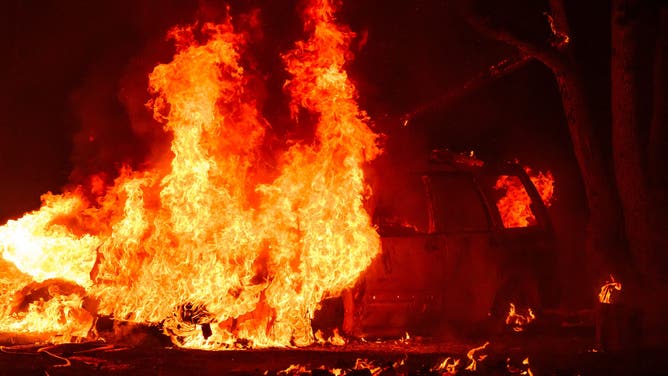 A vehicle is seen in flames as the Park fire continues to burn near Paynes Creek in unincorporated Tehama County, California on July 26, 2024. A huge, fast-moving and rapidly growing wildfire in northern California has forced more than 4,000 people to evacuate as firefighters battle gusty winds and perilously dry conditions, authorities said on July 26. (Photo by JOSH EDELSON / AFP) (Photo by JOSH EDELSON/AFP via Getty Images)