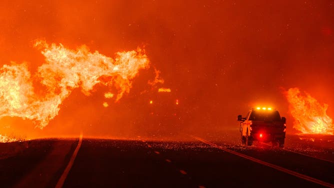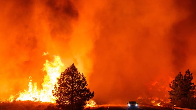 A vehicle drives along Highway 36 while flames tear through the area as the Park fire continues to burn near Paynes Creek in unincorporated Tehama County, California on July 26, 2024. A huge, fast-moving and rapidly growing wildfire in northern California has forced more than 4,000 people to evacuate as firefighters battle gusty winds and perilously dry conditions, authorities said on July 26. (Photo by JOSH EDELSON / AFP) (Photo by JOSH EDELSON/AFP via Getty Images)