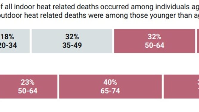 Heat deaths include "heat caused" deaths where environmental heat was directly involved in the sequence of events causing deaths. The number also includes "heat contributed" deaths where the environmental heat contributed to the death but was not in the sequence of events causing the death. Of the deaths, 59% were caused by heat.